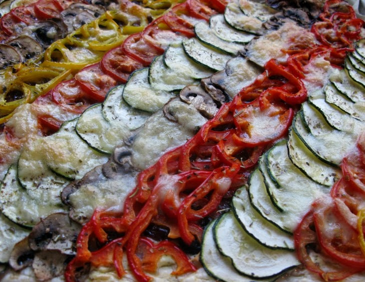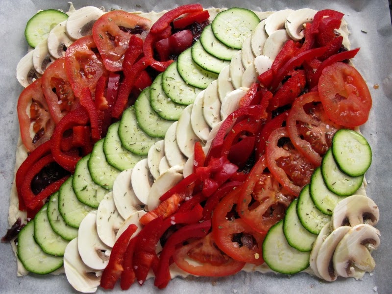 Потребуется: 0,5 кг слоёного теста 1 кг лука 100 г сахара 500 мл сладкого белого вина Разноцветных овощей (баклажаны, помидоры, цукини, паприка) Растительное масло Свежий чабрец или розмарин Соль С овощами не переборщить - 0,5 кг теста (2 листа) вполне хватает 1 паприки, 5-6 красивых шампиньона, 1 молодой цукини, 2-3 помидора